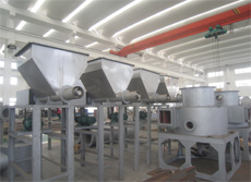 空气经过加热器被加热至~230℃左右,进入旋转闪蒸干燥机。湿料由输送装置送入螺旋加料机构,螺旋加料器可无级调速。物料经挤压后强制进入主塔,随即被高速旋转而又具有不同角度的刀片粉碎,又被高速进入旋转闪蒸干燥机主塔的高温气流冲击高速旋转、夹带上升,这时气流温度急速下降,物料水分迅速蒸发从而完成干燥过程。被干燥的物料随高速高温气流进入脉冲布袋除尘器。气流由滤袋外部进入,向上排出,为防止滤袋积料,由脉冲电磁阀定时、轮流由各滤袋上部输入高压气流(0.5~0.6Mpa),反复反冲滤袋,以达到*佳除尘效果。