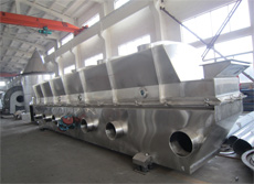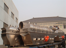 物料自进料口进入机内,在振动力作用下,物料沿水平方向抛掷向前连续运动。热风向上穿过流化床和湿物料换热,湿空气经旋风分离器除尘后由排风口排出,干燥物料由排料口排出。