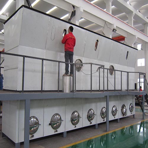洁净的热风经阀板分配进入床体内,从加料器进入的湿物料被热风形成流化状态,如煮沸的开水在床体内跳跃,故称为沸腾干燥器(沸腾干燥机),由于热风与物料广泛接触,因此在较短的时间内就可以干燥。从床体的一头进入,经几分钟至几十分钟时间的“沸腾”,从床体的另一头自动流出。