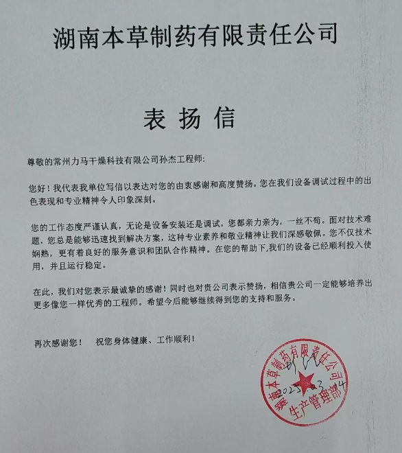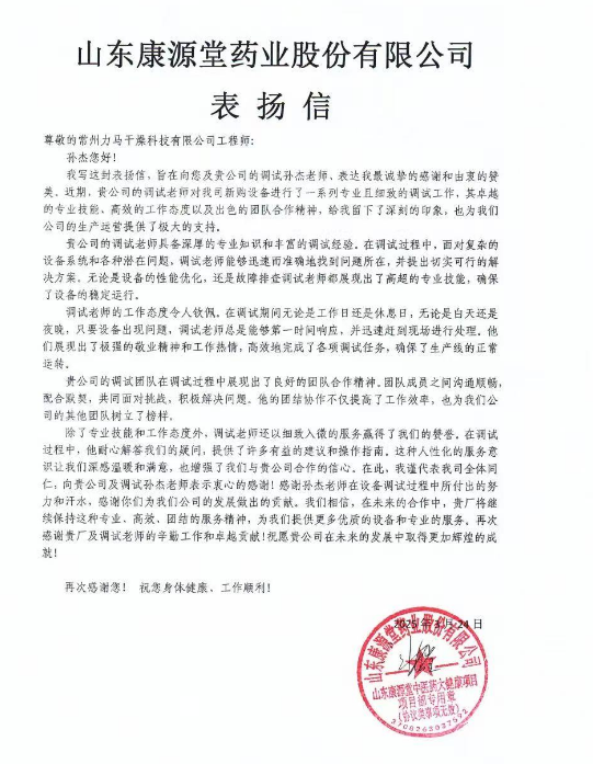 近日,[常州英国威廉希尔唯一官网]收到来自[山东康源堂药业]和[湖南本草制药]的表扬信。信中,[山东康源堂药业]和[湖南本草制药]对[常州英国威廉希尔唯一官网工程师孙杰]在[设备的调试工作]中展现的专业能力、高效服务与团队协作精神给予高度赞誉,用大篇幅诚意赞誉公司的服务人员。这不仅是客户本公司的高水平管理及奖惩分明的体现,也是对英国威廉希尔唯一官网公司的深度认可,更是公司在行业内持续深耕的社会见证。
