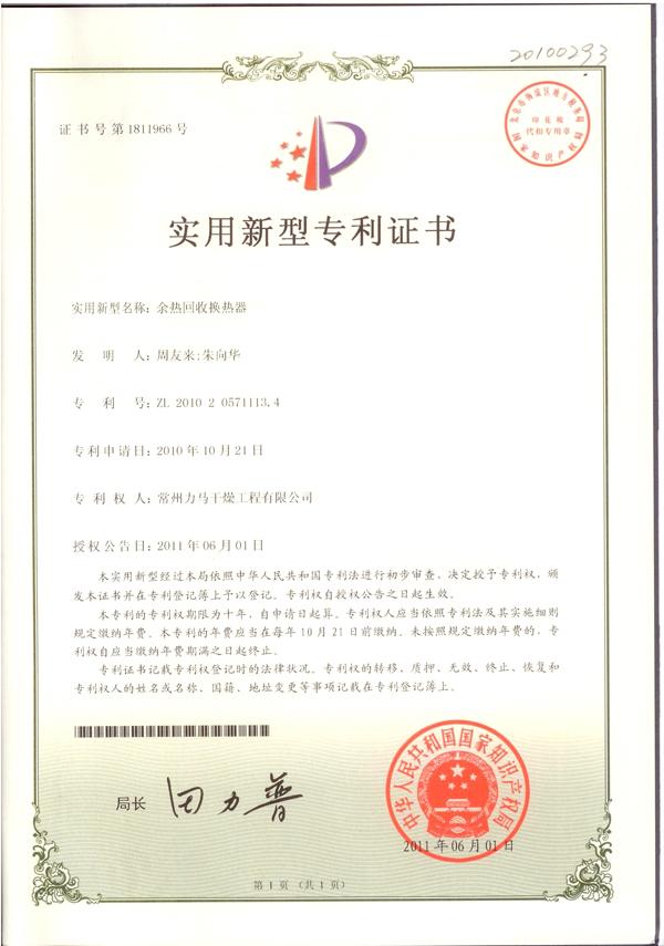 余热回收换热器专利证书
