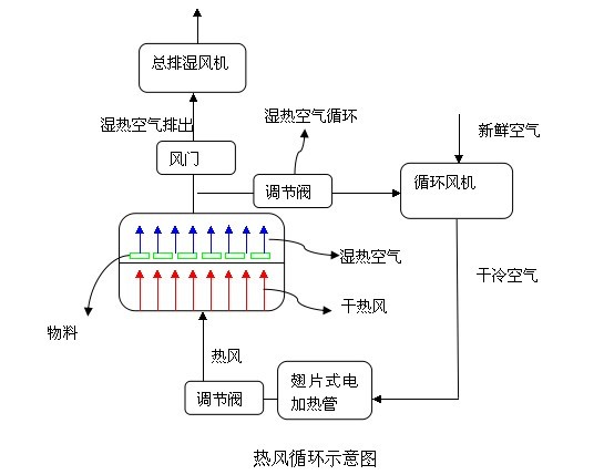 热风循环风机在吸入新鲜空气的同时,吸入一部分从干燥室出来的湿热空气,以充分利用热能。空气经过翅片式电加热管后被加热,送入干燥室由下往上吹送对物料进行烘干,如图所示。