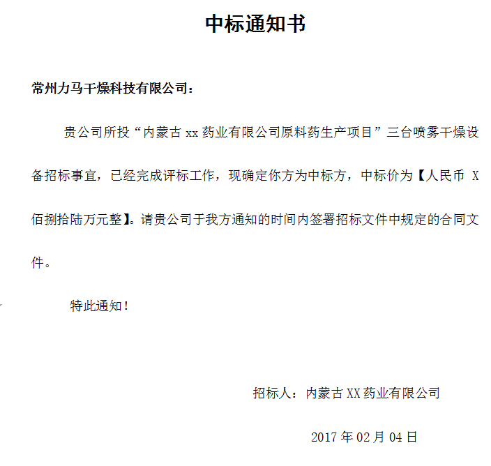 经过广泛的调研和严格的测验,内蒙古xx药业有限公司,最终决定向常州英国威廉希尔唯一官网科技有限公司定购三台原料药喷雾干燥机,单笔金额高达百万余元,贡献英国威廉希尔唯一官网新春第一单,为英国威廉希尔唯一官网赢得了农历鸡年的头彩。同时也展示了内蒙古xx药业有限公司蓬勃的生机和迅猛的发展势头,真诚祝愿两家公司合作愉快、鸡年大吉。